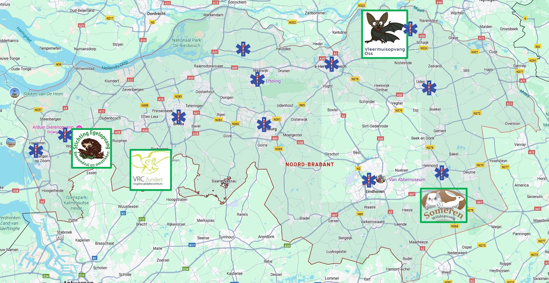 Stichting Fauna Opvang Brabant bestaat qua samenstellende en samenwerkende organisaties uit 4 wildopvang locaties, verdeeld over de provincie Noord-Brabant. Hoe deze provincie breed dekkende wildopvang keten er geografisch uitziet kunt u hierboven zien. Dit is overigens een momentopname, er kunnen andere wildopvang organisaties opgericht worden. Deze zouden dan genoemd moeten worden op de website van Wildopvang. En hieronder een korte beschrijving ervan.